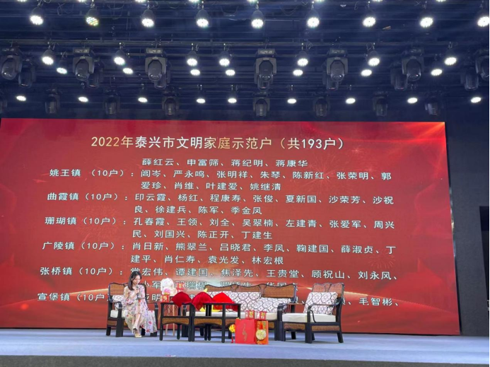 傳承好家風(fēng),一起話團(tuán)圓。活動(dòng)現(xiàn)場對(duì)193戶2022年度泰興市文明示范家庭進(jìn)行表彰。文明家庭代表們孝老愛親、助人為樂、熱心公益、家風(fēng)傳遞的感人故事,通過節(jié)目演出、事跡短片播放、現(xiàn)場采訪、故事分享等環(huán)節(jié)生動(dòng)展現(xiàn)。一句句真摯樸實(shí)的話語,一幅幅溫馨感人的畫面,讓大家在中秋佳節(jié)共同感受家的和諧與溫馨,共同感受文明的魅力和風(fēng)采。 泰興市將文明家庭評(píng)選作為創(chuàng)建全國文明城市的“細(xì)胞工程”,通過層層推薦、嚴(yán)格把關(guān),積極推薦、培育和選樹文明家庭典型,結(jié)合“喜迎二十大”“學(xué)習(xí)回信精神”等主題活動(dòng),大力宣傳文明家庭的感人事跡和崇高精神,讓文明之風(fēng)地吹拂到全社會(huì)各個(gè)角落。
