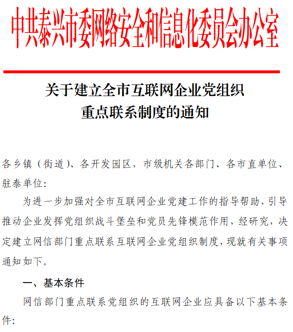 為進一步加強對全市互聯(lián)網(wǎng)企業(yè)黨建工作的指導(dǎo)幫助,引導(dǎo)推動企業(yè)發(fā)揮黨組織戰(zhàn)斗堡壘和黨員先鋒模范作用。近日,泰興市委網(wǎng)信辦發(fā)布互聯(lián)網(wǎng)企業(yè)黨組織重點聯(lián)系制度。 一、基本條件 網(wǎng)信部門重點聯(lián)系黨組織的互聯(lián)網(wǎng)企業(yè)應(yīng)具備以下基本條件: 1.政治基礎(chǔ)強,始終堅持“兩個維護”,重視黨的建設(shè),企業(yè)黨組織一般是先進基層黨組織; 2.“兩個健康”發(fā)展走在前列; 3.在地方經(jīng)濟建設(shè)中有較重分量,在互聯(lián)網(wǎng)行業(yè)內(nèi)有較大影響或發(fā)展?jié)摿Α?/font> 二、聯(lián)系內(nèi)容 網(wǎng)信部門會同組織部門及企業(yè)所在地上級黨組織,重點圍繞以下內(nèi)容開展聯(lián)系: 1.指導(dǎo)黨組織宣傳黨的主張、貫徹黨的決定; 2.指導(dǎo)黨組織強化自身建設(shè),發(fā)揮好黨組織和黨員作用; 3.指導(dǎo)建立聯(lián)系服務(wù)人才等制度,促進企業(yè)發(fā)展; 4.聽取黨組織和黨員意見建議。 三、工作要求 1.網(wǎng)信部門要加強責任落實,明確專人負責重點聯(lián)系的互聯(lián)網(wǎng)企業(yè)黨組織黨建工作開展。 2.重點聯(lián)系的互聯(lián)網(wǎng)企業(yè)黨組織所在地組織部門,要嚴格屬地企業(yè)黨組織管理,做好黨的建設(shè)日常工作,配合做好市委、市委網(wǎng)信辦的重點聯(lián)系工作。 3.網(wǎng)信部門和重點聯(lián)系的互聯(lián)網(wǎng)企業(yè)黨組織要加強工作配合,建立健全定期聯(lián)系、信息互通、工作反饋、協(xié)調(diào)會商等制度。注重總結(jié)經(jīng)驗、研究問題,指導(dǎo)推動面上工作開展,并努力把重點聯(lián)系單位建成所在地區(qū)和行業(yè)內(nèi)的黨建示范樣板。 4.重點聯(lián)系的互聯(lián)網(wǎng)企業(yè)黨組織定期向網(wǎng)信部門和上級黨組織報告工作,網(wǎng)信部門及時開展調(diào)查研究,提供工作指導(dǎo),總結(jié)推廣經(jīng)驗。對重點聯(lián)系的互聯(lián)網(wǎng)企業(yè)黨組織名單實行動態(tài)管理。 |