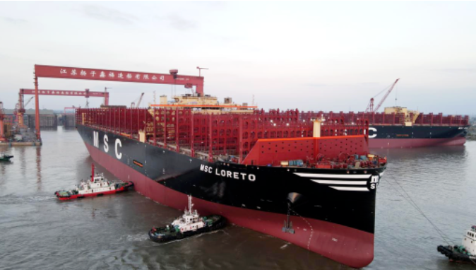近日,在長江黃金岸線上,一艘紅色涂裝、黑色流線型船體、船身印有MSC標(biāo)記的超大型集裝箱船鳴響汽笛順利出塢! 這是今年以來江蘇揚(yáng)子鑫福造船有限公司為交銀租賃、地中海航運(yùn)(MSC)建造的第三艘24000TEU超大型集裝箱船,也是目前全球載重量最大裝箱量最大的新一代超大型集裝箱船型。