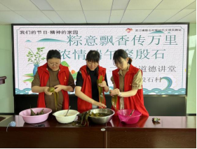 活動開始前,志愿者們早早的來到會場,把提前泡好的粽葉、糯米等材料整齊地擺放好,志愿者們站在一起包粽子,手藝嫻熟的,傳授給“新手”包粽子的技巧和心得,活動現(xiàn)場洋溢著濃濃的端午氣息。下午2點活動正式開始,全程緊緊圍繞“端午”這一主題,介紹了端午節(jié)的來歷、風俗習慣及其所蘊含的愛國主義思想,誦讀了經(jīng)典現(xiàn)代詩《汨羅不滅的永恒》、聆聽吟唱了愛國主義歌曲《離騷》,以先賢的偉大的精神和詩歌余韻,帶給大家新的思考。 在談感悟環(huán)節(jié),殷石村黨總支副書記孫明萍分享端午節(jié)背后的家國情懷,激發(fā)了黨員干部群眾愛國、愛黨、愛崗的熱情。活動最后,黨總支書記蔣彬同志與黨總支副書記石輝、孫明萍給困難群眾代表送去了粽子、牛奶等慰問品,讓他們在佳節(jié)來臨之際切實感受到村“兩委”的關(guān)懷,進一步營造了“暖心、貼心、安心”的節(jié)日氛圍。