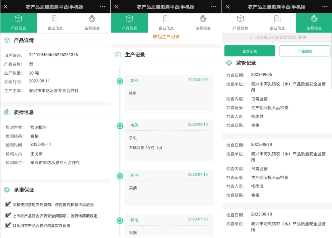消費者通過掃碼,可以查詢到每一批貨的生產(chǎn)地點、產(chǎn)品品名、產(chǎn)品認證信息、檢測信息等,讓假冒偽劣產(chǎn)品無處遁形,確保消費者買的安心,食用放心。泰興市還依托農(nóng)產(chǎn)品追溯制度,幫助各鄉(xiāng)鎮(zhèn)街道、園區(qū)爭創(chuàng)四星級農(nóng)產(chǎn)品質(zhì)量安全監(jiān)管站,開展承諾-抽檢-達標-發(fā)證,將屬地多家養(yǎng)殖主體納入省級管理平臺統(tǒng)一監(jiān)管,涵蓋種植業(yè)、水產(chǎn)品養(yǎng)殖業(yè)、畜禽養(yǎng)殖業(yè)等多個食品供應(yīng)鏈企業(yè)。今年,泰興市加大建設(shè)承諾達標合格證服務(wù)站點,做好企業(yè)服務(wù)工作。