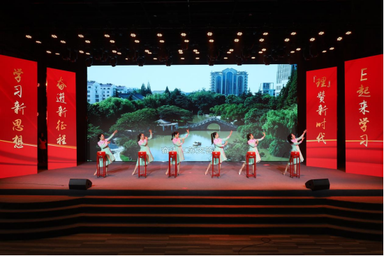 “家喻戶曉都知道,人民生活尤如芝麻開(kāi)花節(jié)節(jié)高……”鏗鏘有力的鼓兒書(shū)將新時(shí)代的家國(guó)情懷娓娓道來(lái),為現(xiàn)場(chǎng)觀眾帶來(lái)了一場(chǎng)盛大的精神文明盛宴。緊接著,音詩(shī)畫(huà)《秋江心潮》、大合唱等節(jié)目輪番上演,以“理論+文藝”的形式將黨的創(chuàng)新理論送到群眾心坎上。
