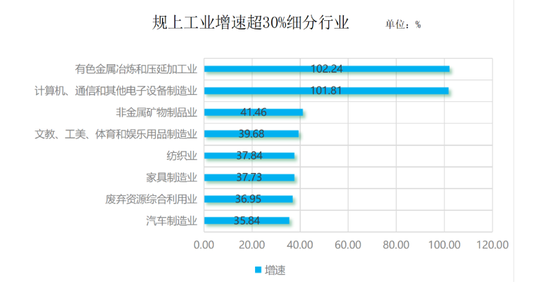 從規(guī)上工業(yè)看,化工及新材料、機(jī)電、醫(yī)藥、輕紡、農(nóng)副產(chǎn)品加工等五大產(chǎn)業(yè)用電量全線飄紅,有色金屬冶煉和壓延加工業(yè)、電子設(shè)備制造業(yè)、非金屬礦物制品業(yè)、文教工美體育和娛樂(lè)用品制造業(yè)、紡織業(yè)、家具制造業(yè)、廢棄資源綜合利用業(yè)、汽車制造業(yè)等8個(gè)細(xì)分行業(yè)均出現(xiàn)35%到102%不等的增幅。 |