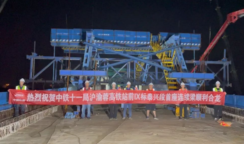 7月15日,由中鐵十一局承建的滬渝蓉高鐵(北沿江高鐵)泰興段內,第一座連續(xù)梁完成合龍。23點18分,隨著一陣喜慶的煙花爆竹聲響起,滬渝蓉高鐵通泰揚特大橋跨規(guī)劃S504連續(xù)梁開始合龍。施工現場,數十名工人各司其職,緊密配合。在施工人員的精準操控下,攪拌好的混凝土源源不斷地被注入施工處,F場技術負責人告訴小編,之所以選在夜間11點多進行施工,主要是出于對施工要求的考慮。連續(xù)梁合龍段澆筑,需要在一天中溫度最低時施工,以保證施工的質量和效率。