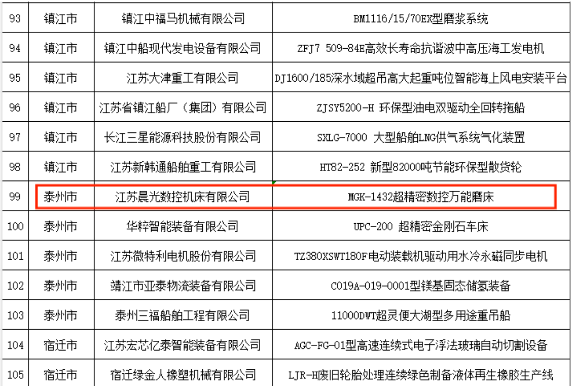 近日,江蘇省工業(yè)和信息化廳發(fā)布了《關(guān)于2024年江蘇省首臺(tái)(套)重大裝備名單的公示》。江蘇晨光數(shù)控機(jī)床有限公司成功入選。截至目前,泰興市共有28個(gè)產(chǎn)品被認(rèn)定為江蘇省首臺(tái)(套)重大裝備,連續(xù)12年保持增長態(tài)勢。