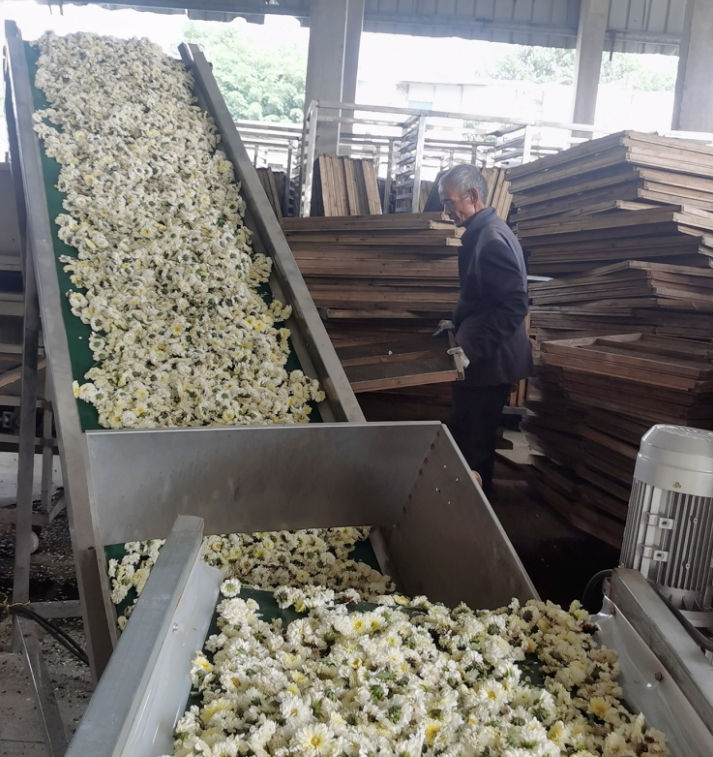 為了延伸菊花產業(yè)鏈,老葉村配套建設了菊花深加工車間,將剛采摘下來的菊花經過殺青、烘干、分揀、裝箱等工序后進行銷售,進一步提高菊花的產值。