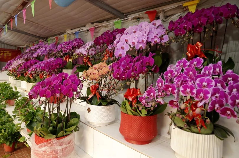 走進(jìn)南門花卉市場(chǎng),仿佛踏入了一片花的海洋。這里年宵花品種豐富,從經(jīng)典的蝴蝶蘭、杜鵑、君子蘭,到各種創(chuàng)意花藝作品,琳瑯滿目,應(yīng)有盡有。蝴蝶蘭,被譽(yù)為“洋蘭皇后”,以其優(yōu)雅的姿態(tài)和豐富的色彩,在春節(jié)這個(gè)特別的節(jié)日里盡情綻放,成為了花市中的佼佼者。這里的蝴蝶蘭品種繁多、色彩斑斕,從經(jīng)典的粉色、黃色,到獨(dú)特的紫色、白色,每一朵都展示著大自然的神奇和美麗,讓人目不暇接。