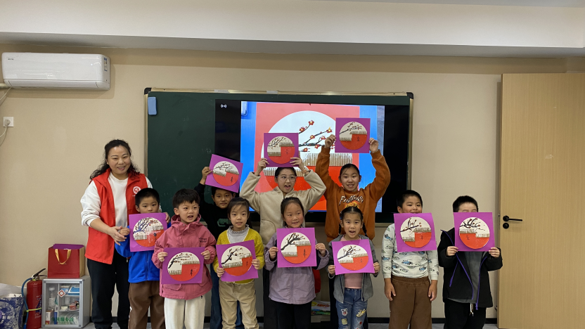 過(guò)程中,孩子們互相幫助、盡情發(fā)揮——有的細(xì)致裝飾屋檐,有的用墨色濃淡表現(xiàn)梅枝姿態(tài),還有的認(rèn)真題寫(xiě)“立冬”字樣。志愿者從旁鼓勵(lì)、協(xié)助,現(xiàn)場(chǎng)洋溢溫馨與歡笑。完成作品后,孩子們踴躍展示并分享構(gòu)思,眼中充滿(mǎn)成就感。