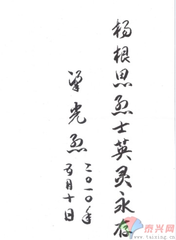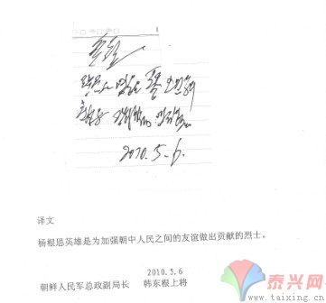 中央軍委委員、國務(wù)委員、國防部長梁光烈的題詞為:“楊根思烈士英靈永存。”朝鮮人民武裝力量部副部長樸在京的題詞為:“楊根思烈士永遠(yuǎn)活在朝鮮人民的記憶之中!”朝鮮人民軍總政副局長韓東根上將的題詞為:“楊根思英雄是為加強(qiáng)朝中人民的友誼做出貢獻(xiàn)的烈士。” 毛文托說,前不久,他應(yīng)解放軍總政治部之邀,參加了由獲得“朝鮮民主主義人民共和國英雄”稱號(hào)的志愿軍烈士親屬和毛岸英烈士親屬組成的中國人民志愿軍英模烈屬訪朝代表團(tuán),有幸受到中央軍委委員、國務(wù)委員、國防部長梁光烈和朝鮮人民武裝力量部副部長樸在京等的親切接見,他們盛贊“楊根思烈士是為了祖國,為了朝鮮人民而英勇犧牲,其精神將永存中朝大地”。