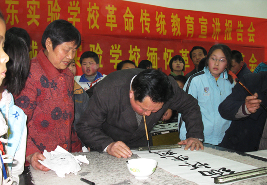 共和國(guó)60年建設(shè)成就郵票人物、世博中國(guó)題賀藝術(shù)名家、泰興市姚王鎮(zhèn)書畫協(xié)會(huì)會(huì)長(zhǎng)盧富祥向師生們表演“左手書、右手書、雙手齊書、口書”四功能書法。