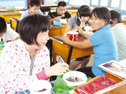 8時,殷亞平跟著學生一起走進課堂,其實今天上午她沒有上課任務。同事小張告訴記者:“她就是沒課也不會閑著,會坐在教室的最后面聽課,直到放學。”殷亞平說,這樣既可以增加對學生其它學課成績的了解,督促上課不自覺的學生專心聽課,又可以拓寬自己的知識面,更好地輔導學生全面進步。殷亞平發(fā)明的“聽課管理”法,被全校老師效仿。 每天中午,殷亞平都不回家,因為班上有6名留守兒童。上午第三節(jié)課結束后,她會主動到校門口把6名學生家人送來的飯菜,接到學校飯?zhí)脽岷煤笤俣说浇淌,然后自己泡上一碗方便面和學生們邊吃邊聊。