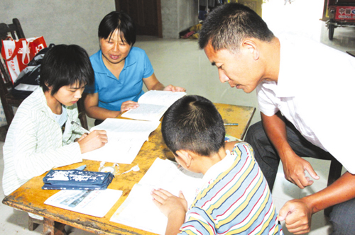 “農(nóng)村的孩子由于父母親都要急著出去打工,所以中午學生們一般都很早離開家,曾經(jīng)發(fā)生過在外上網(wǎng)、打架的事,為了不讓他們在外犯錯誤,我要求他們必須在12時50分到校午睡。他們睡了,我就在這里照顧他們并備課和批改作業(yè)。”殷亞平介紹。 “殷老師,我的手已經(jīng)好了,請老師不要擔心!”說起這條短信,殷亞平淚流滿面,學生小丁也情不自禁地和她擁抱在一起,讓外人誤認為是一對母女。小丁在一次運動時左手不幸受傷,為了不影響學習,殷亞平像照顧自己女兒一樣,關心著她的生活和學習。去年,小丁去外地醫(yī)院治療,病情剛有所好轉,小丁就迫不及待地發(fā)短信告訴她。小丁說:“殷老師就像我母親,值得我信任。” 下午第二節(jié)是殷亞平的語文課,今天講的是《陳涉世家》,記者走進課堂也深深被殷老師深入淺出的講解所吸引。第三節(jié)是她的班會課,這次她和學生們一起討論的題目是:如何做朋友? “孩子學習在班上第7名,我們一定會照顧好她,讓她的父母在外面放心......”每天下午5時35分,是放學時間,殷亞平總是和6名留守孩子一起走出校門,一一交給他們的家人。女生小吳的父母在外打工,爺爺奶奶相繼去世,由外公外婆負責照料,當她們不能安時來校時,殷亞平總是和老公一起把她送回家,并輔導她做完作業(yè)再離開。 天黑了,記者一天的生活體驗結束了,和殷亞平告別時,她的手機又突然響起來,有一孩子突然肚子疼得厲害,爺爺奶奶束手無策,請她速去幫忙。殷亞平夫婦二話沒說,騎上車消失在夜幕中。 |