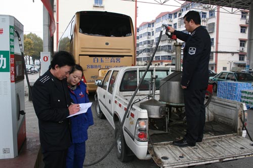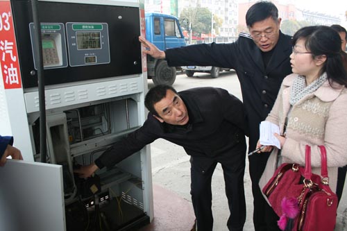 在市區(qū)南門加油站,質(zhì)監(jiān)局工作人員重點(diǎn)檢查了加油機(jī)是否執(zhí)行強(qiáng)制檢定,鉛封、標(biāo)志是否完好,是否存在短斤少兩現(xiàn)象。