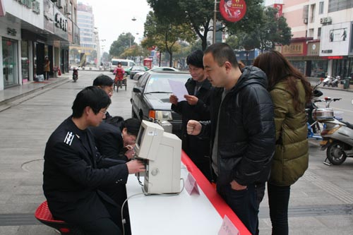 在鼓樓廣場康明眼鏡店門前,市計(jì)量所的工作人員攜帶專業(yè)檢測儀器,為過往群眾提供眼鏡、血壓計(jì)現(xiàn)場免費(fèi)檢定。