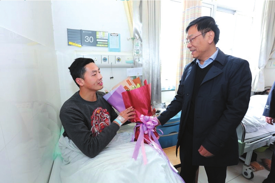 “周某刺向林帥時,大聲叫囂著‘我死,必須帶走一個!’在他拔刀再次捅向林帥時,我抓住剪刀,林帥順勢抓住周某的左手,我們兩個人合力將周某摔倒在地。”王鋒回憶說。“周某個子高,力氣很大,地又滑,倒地后,他右手掙脫我的控制,握著剪刀一直亂揮亂舞,我們幾個人花了很長時間才將他按住,掏手銬時,看到手上在流血才知道自己受傷了。完全控制住周某后,是戰(zhàn)友發(fā)現(xiàn)我的頭部和左耳后部也有傷口,醫(yī)生給我縫了20針。”王鋒顯得很淡然。 記者注意到,王鋒的左手食指、中指和左耳后部都有縫合的創(chuàng)口,特別是耳后的傷口長達十多厘米。 林帥說:“從破門到周某被完全控制,大概十分鐘左右,周某的第一刀刺穿了我的警服,第二刀直接捅向了我的脖子,生死瞬間,是戰(zhàn)友王鋒救了我的命,他是我的救命恩人!” 記者問王鋒,當時不害怕嗎?王鋒笑了:“當時的情況下不可能多想,也沒有時間多想,我當過武警,這是本能,我不能讓戰(zhàn)友受傷,必須迅速控制住周某的右手,不讓他再捅第二刀。說不怕是假的,我也是第一次遇到這種情況,但如果下次遇上同樣的情況,我還會這么做!” 據(jù)了解,在這次行動中,還有一名輔警受傷。案發(fā)后,泰興市委、市政府、市政法委、公安局的領(lǐng)導和社會各界人士先后到醫(yī)院,向恢復中的受傷人員表示慰問。 11月30日下午,警方暫以涉嫌妨害公務罪依法將犯罪嫌疑人周某刑事拘留。 記者 姚翔 特約記者 裕順 |