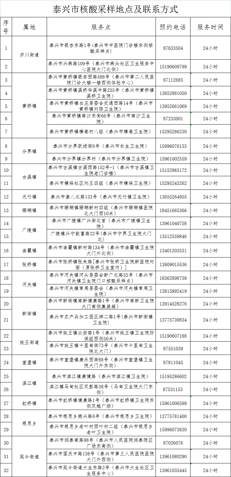 關(guān)于公布泰興市24小時核酸采樣地點的通知